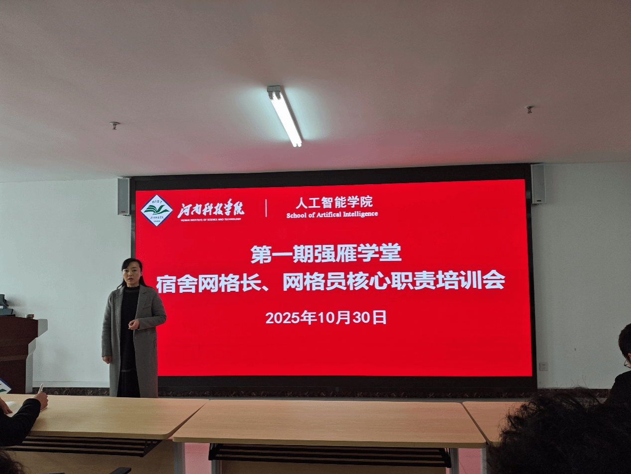 为进一步明确宿舍网格长、网格员的工作方向,提升宿舍管理服务效能,筑牢学生成长安全防线,10月30日中午,人工智能学院在弘德楼B310举行第一期强雁学堂——宿舍网格长、网格员核心职责培训会。学院党委书记叶晖、党委副书记申冲、辅导员卢留洋和全体宿舍网格长、网格员参会。